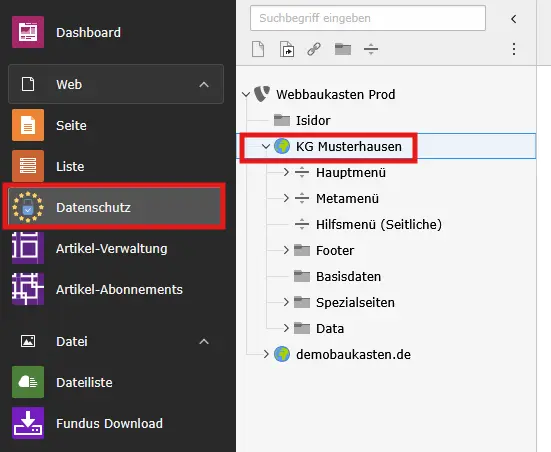 Klicken Sie als erstes im Seitenbaum auf Ihre Startseite, also die Seite mit dem Weltkugel-Icon, und danach links auf das Webmodul "Datenschutz"